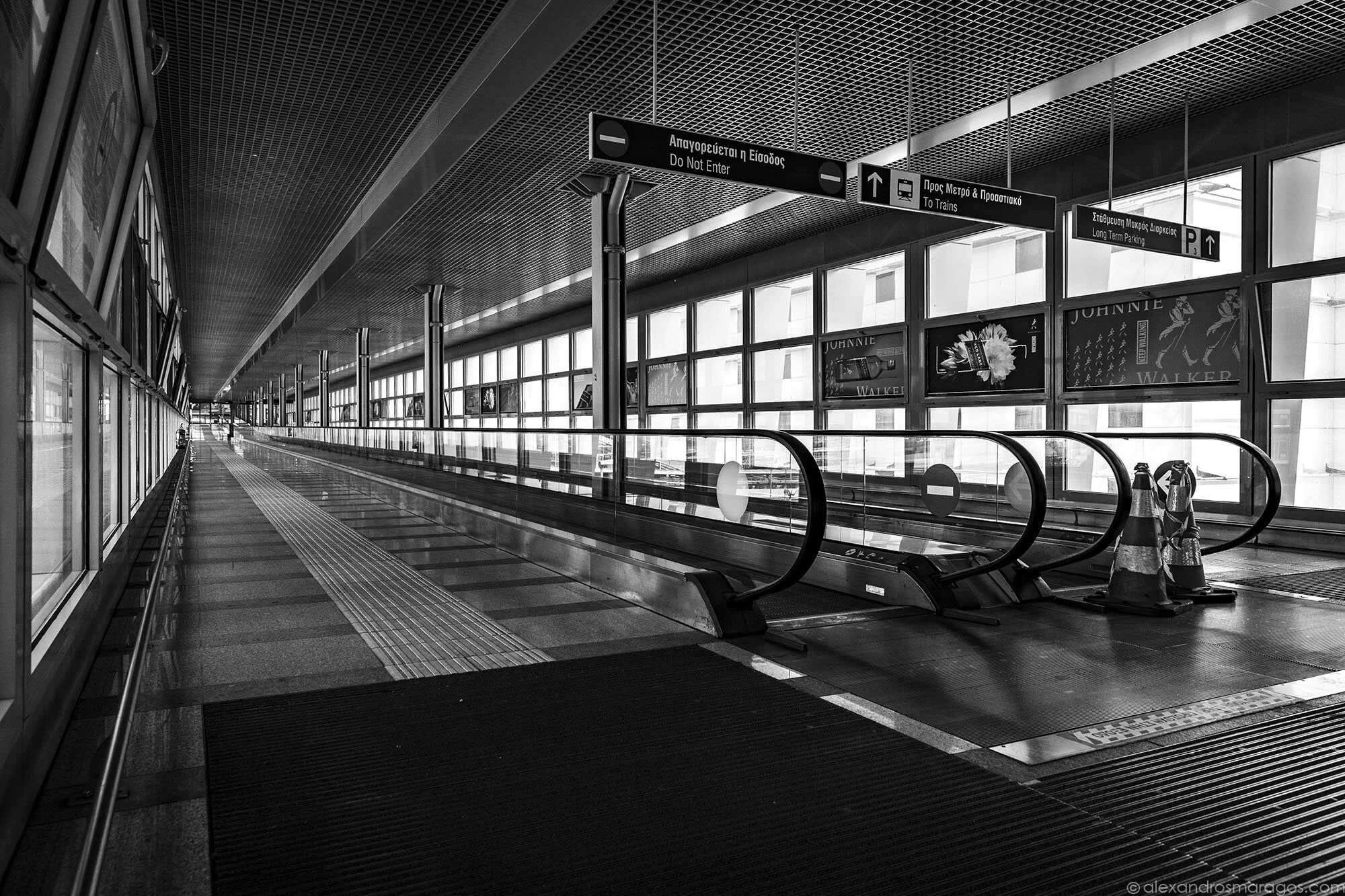 The moving walkway connecting the train terminal to Athens International Airport “Eleftherios Venizelos” move passengerless in Athens, Greece on April 20, 2020